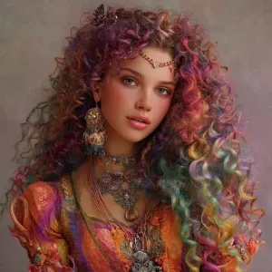 «An enchanting woman with cascading curly hair in vibrant rainbow...»