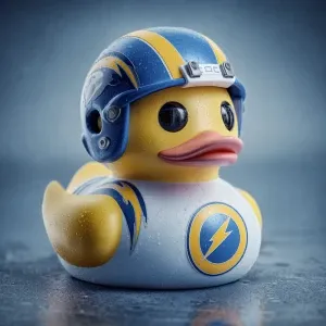 «A 3d image of a rubber duck wearing a football helmet and with t...»