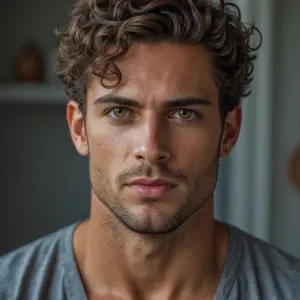 «A handsome  light-skinned man, hazel  eyes,  short curly hair,...»