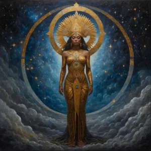 «In the center of the cosmic canvas, a celestial being adorned in...»