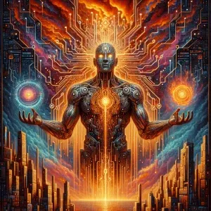 «Create an acrylic painting depicting a cybernetic deity standing...»