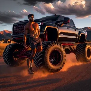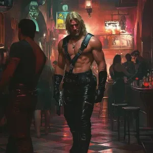 «A towering, muscular man emits a soft golden aura as he leans no...»