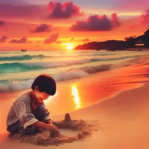 «A serene beach scene at sunset with a child playing in the sand.»