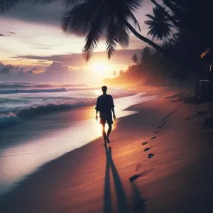 «I stroll along the seaside beach at dusk.»