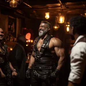 «Design a sophisticated, dimly illuminated leather-adorned bar sc...»