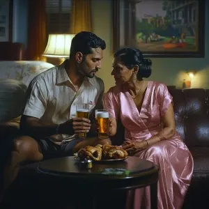 «Imagine a dimly lit lounge with a lavish stage where glittering...»