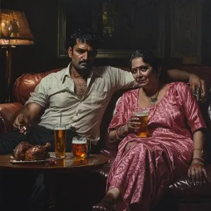 «Photohyperrealism,a muscular criminal man sitting drinking bee...»