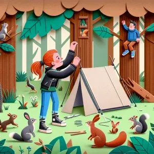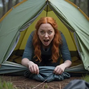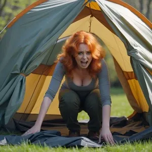 «Image of a ginger haired woman comically setting up a tent, with...»