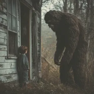 «A humanoid looking hair covered sasquatch grabs a aerial of a wo...»