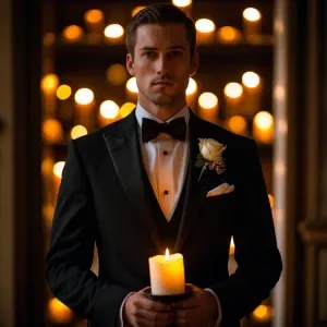 «photography, look to the front, a groom in a wool or velvet suit...»