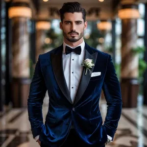 «photography, look to the front, a groom in a velvet tuxedo with...»
