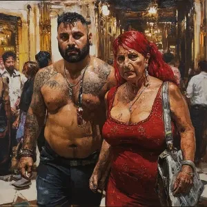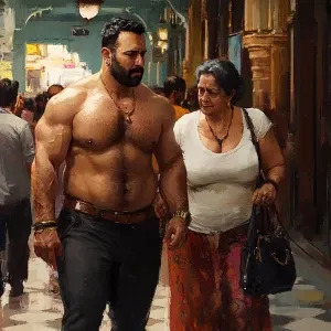 «realism art 1:1 .A sweaty beefy man walking with his 54 year old...»