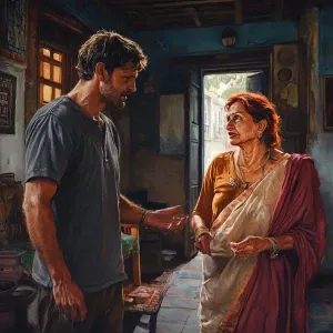 «Realism style 1:1,A muscular sweaty man talking to his 54 year o...»