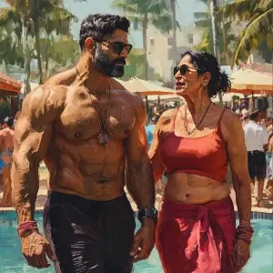 «Realism art 1:1,A muscular beefy sweaty man and his 50-year-old...»