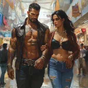 «Realism,sharp art.a muscular sweaty beefy tattoed man ,walking...»