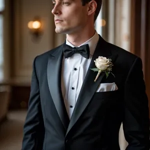 «Photography, half body photo, a groom in a classic black tuxedo...»