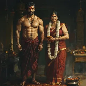 «Realism ,sharp art.a muscular sweaty criminal celebrating diwali...»