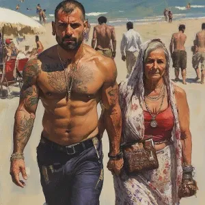 «Realism,sharp art.a muscular sweaty man walking with a 55 year...»