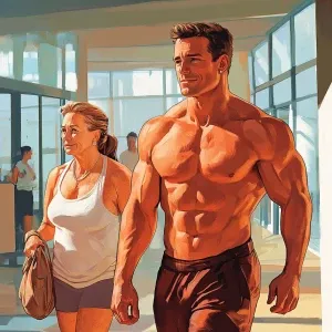 «Illustration.A man muscular beefy sweat walking with his 54 ye...»