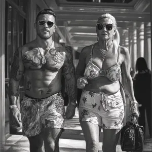 «Realism,sharp art,detailed.a man muscular beefy sweaty walking w...»