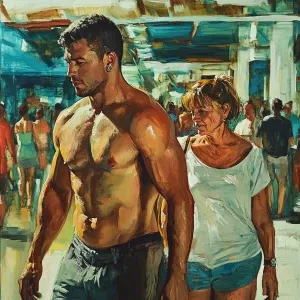 «Illustrative,oil painting.A man muscular beefy sweat walking wi...»