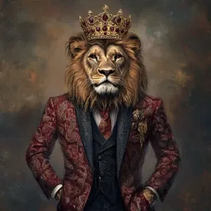 «A majestic lion stands as the focal point, crowned with a luxuri...»