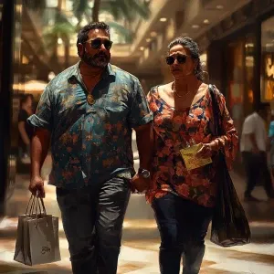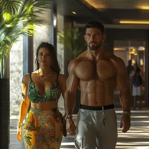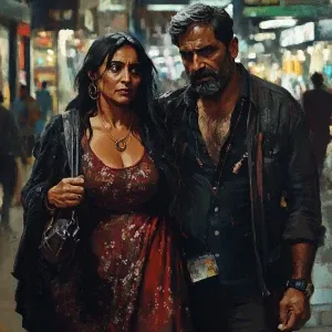 «Digital,A man( muscular beefy criminal) walking with a woman(his...»