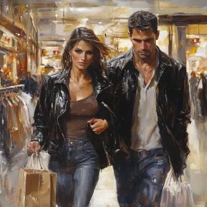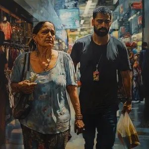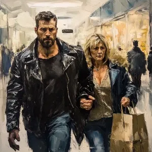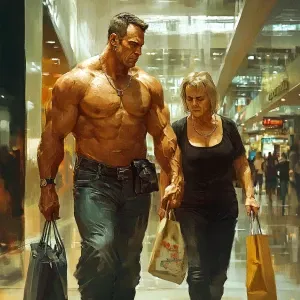 «Fantasy art,a man(beefy muscular criminal)walking(shopping)with...»