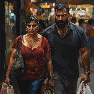 «Realism art,a man(beefy muscular criminal)walking(shopping)with...»