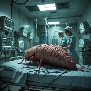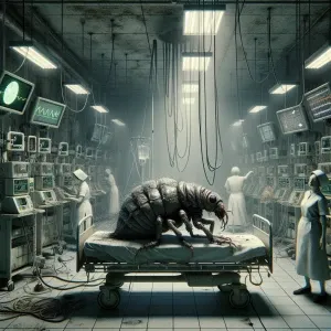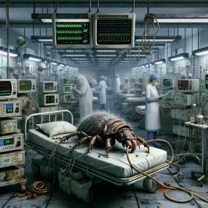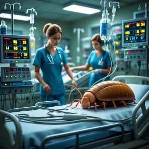 «"Create an image of an anthropomorphic louse in a hospital criti...»