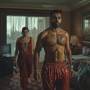 «Create a hyper-realistic image of a muscular, sweaty man enterin...»