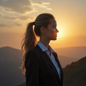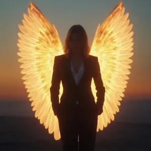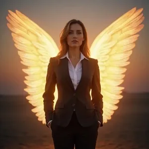 «Generate an image depicting a female guardian angel in a busines...»