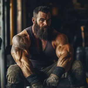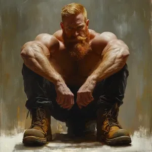 «photograph, muscular man with beard, wearing yellow hard hat, wh...»