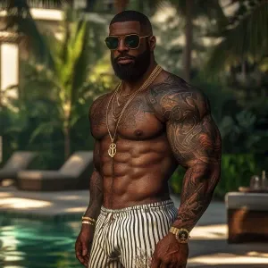 «a muscular, bearded man with dark skin, wearing sunglasses, a go...»