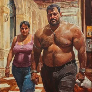«Realism painting,a muscular beefy sweaty gujarati man dancing wi...»