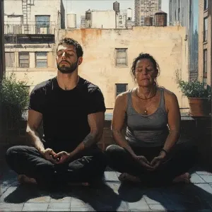 «Realism art,A man(muscular beefy sweaty doinga yoga) sitting wit...»