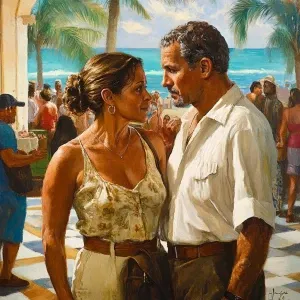 «realism art,A man(muscular beefy sweaty) sitting with a woman(hi...»