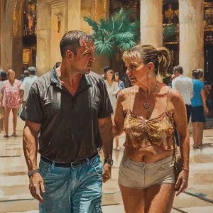«Realism,a man (muscular beefy sweaty) walking with a woman(his 5...»
