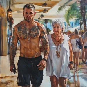 «HyperRealism.A man( muscular beefy criminal) walking with a woma...»