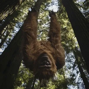 «A humanoid looking hair covered sasquatch hanging upside-down hi...»