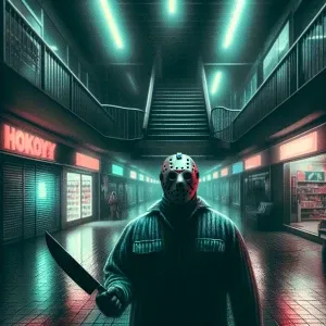«"dark abandoned mall, a menacing figure in a hockey mask with a...»