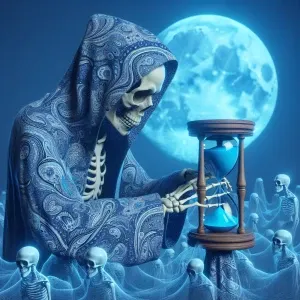 «Generate an image of a skeleton wearing a blue paisley print hoo...»