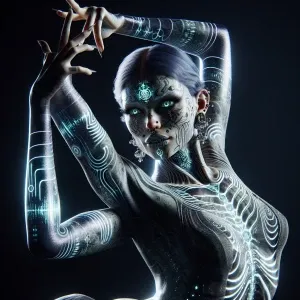 «In a vividly swirling galaxy, a shimmering figure emerges: an or...»