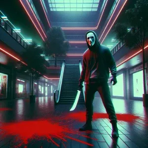 «"dark abandoned mall, a menacing figure in a michael Myers mask...»