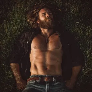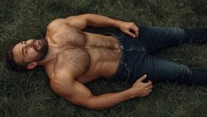 «a beef man hairy chest beard with brown hair dark jeans laying d...»