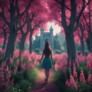 «Create a fantasy-style image featuring a young girl walking thro...»