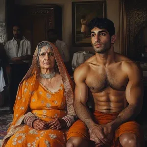 «art style 1:1,A muscular sweaty man talking to his 54 year old...»
