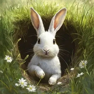 «create an image of a white rabbit coming out of a hole in a gras...»