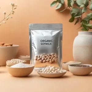 «organic soymilk powder, milk in aluminum bag , light orange bac...»