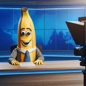 «Фото Банана лицом где он сидит в Телевидение и говорит новости»